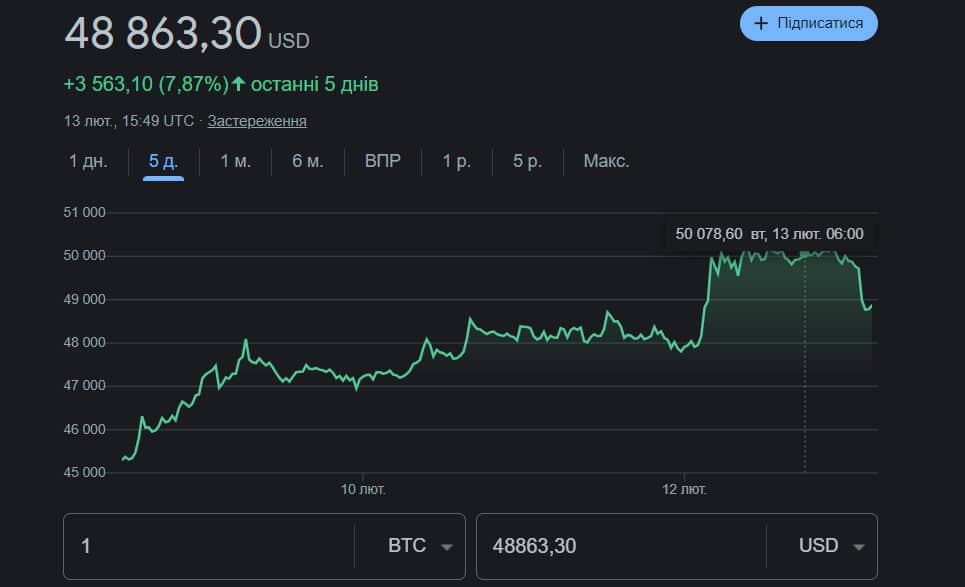 Курс криптовалюти Bitcoin перевищив позначку 50 000 доларів увечері 12 лютого. На момент написання новини цифрова монета торгується за ~48 870 доларів, виходить із даних біржі Binance.