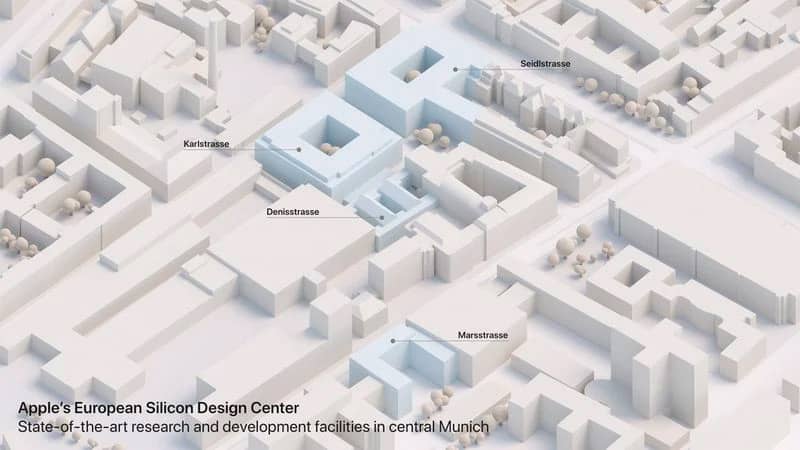 На додаток до нового об'єкта Apple на Seidlstrasse, команди займуть кілька додаткових приміщень для досліджень та розробок на Denisstrasse та Marsstrasse у рамках розширення Silicon Design Center. Три нові об'єкти розташовані через дорогу від нещодавно відкритого науково-дослідного центру Apple на Karlstrasse. Разом з інженерними майданчиками на Arnulfstrasse та Hackerbrücke нові об'єкти утворюють Apple European Silicon Design Center, розташований у центрі Мюнхена, в районі Maxvorstadt.