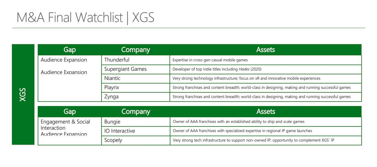 Інший документ від 2021 року перераховує ігрові компанії, що розглядалися Microsoft до придбання. Серед них студія Bungie (належить Sony з 2022 року), Niantic, Zynga (належить Take-Two з 2022 року) та IO Interactive.