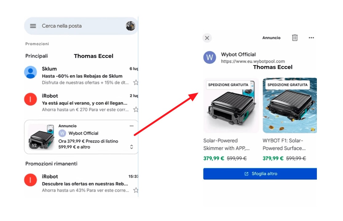 За даними порталу Search Engine Land, нововведення вже доступне деяким користувачам із тестової групи. Йдеться про розширений формат рекламних оголошень у папці «Промоакції». Від звичайної добірки листів він відрізняється наявністю карток товарів прямо в заголовку, які по кліку розгортаються в карусель зі схожих пропозицій.