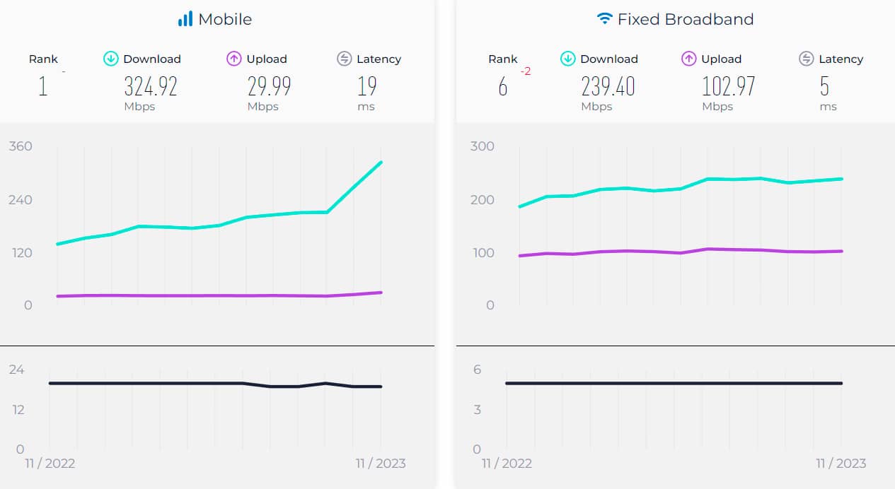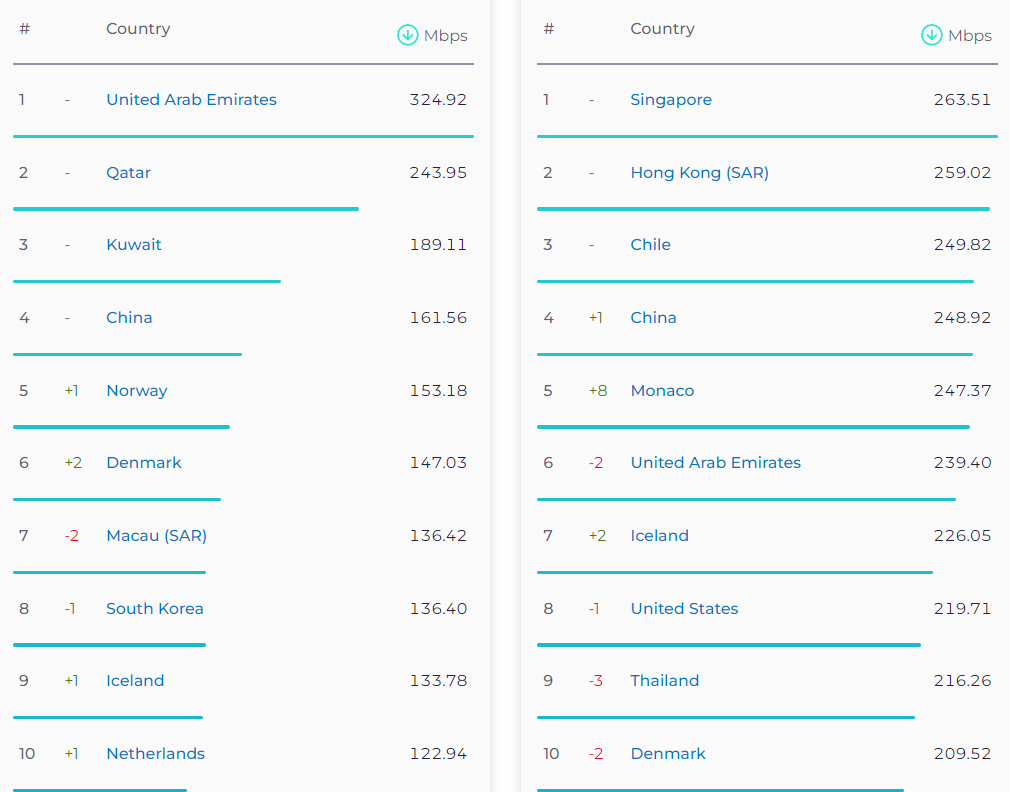 Об'єднані Арабські Емірати з 324,92 Мбіт/с виявилися першими у списку країн за швидкістю мобільного інтернету. Далі йде Китай (161,56 Мбіт/с), Норвегія (153,18 Мбіт/с), Данія (147,03 Мбіт/с), Південна Корея (136,40 Мбіт/с) та Нідерланди (122, 94 Мбіт/с).
