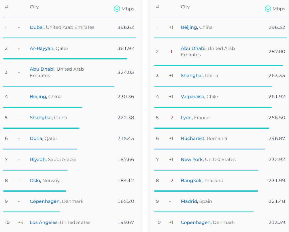 До топ-10 міст із найшвидшим мобільним інтернетом увійшли Дубай, ОАЕ (386, 62 Мбіт/с), Ар-Райян, Катар (361,92 Мбіт/с), Абу-Дабі, ОАЕ (324,05 Мбіт/с) , Пекін, Китай (230,36 Мбіт/с), Шанхай, Китай (222,38 Мбіт/с), Доха, Кувейт (215,45 Мбіт/с), Ер-Ріяд, Саудівська Аравія (187,66 Мбіт/с) ), Осло, Норвегія (184,12 Мбіт/с), Копенгаген, Данія (165,20 Мбіт/с) та Лос-Анджелес, США (149,67 Мбіт/с).
