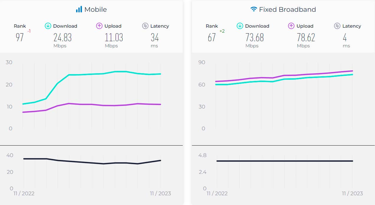 За швидкістю мобільного інтернету Україна посіла 97-е місце із середнім показником у 24,83 Мбіт/с, а ось за швидкістю стаціонарного інтернету країна знаходиться на 67-му місці з 73,68 Мбіт/с, показавши зростання на два пункти порівняно з минулим роком.