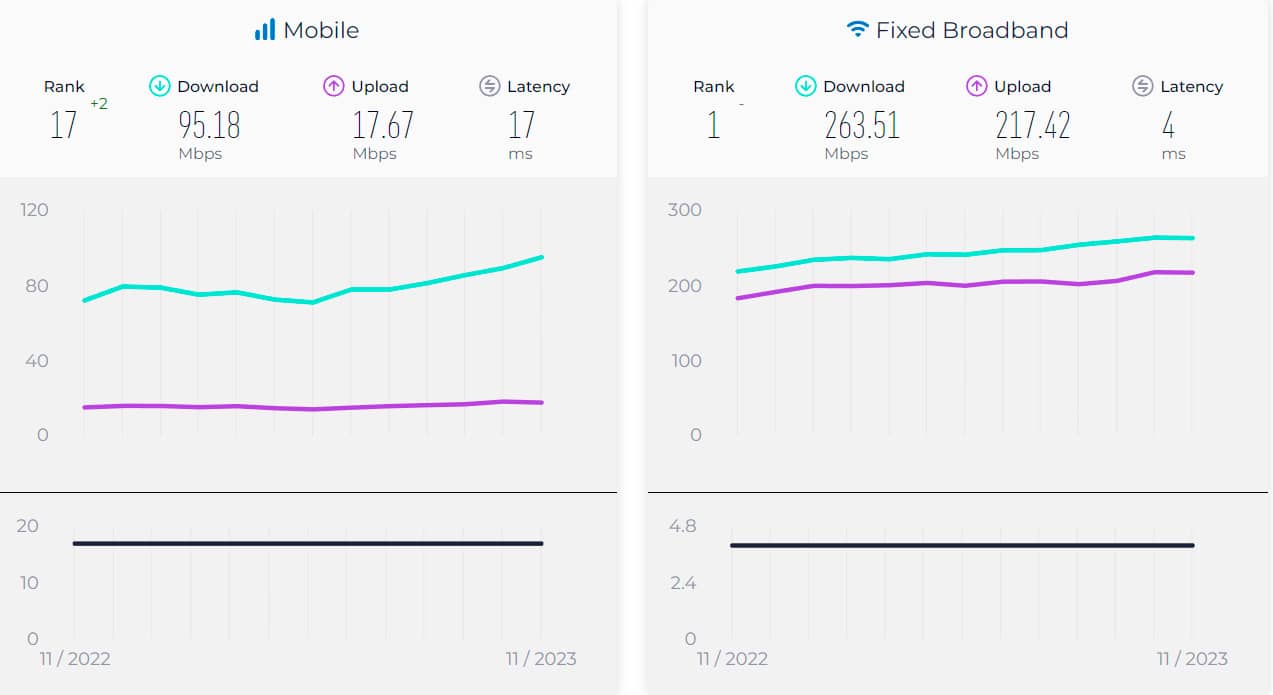 Перше місце у десятці країн-лідерів за швидкістю стаціонарного інтернету увійшли Сінгапур (263,51 Мбіт/с), Гонконг (259,02 Мбіт/с), Чилі (249,82 Мбіт/с), Китай (248,92 Мбіт/с) ), Монако (247,37 Мбіт/с), ОАЕ (239,40 Мбіт/с), Ісландія (226,05 Мбіт/с), США (219,71 Мбіт/с), Таїланд (216,26 Мбіт/с) ), Данія (209,52 Мбіт/с).