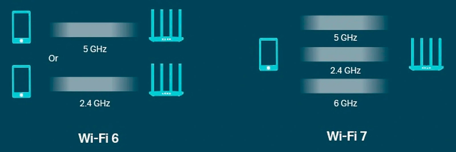 Починаючи з Wi-Fi 5 бездротова мережа працює у двох діапазонах, підтримуючи 2,4 та 5 ГГц. З приходом Wi-Fi 6E пристроям став доступний «незайманий», тобто не забитий безліччю гаджетів діапазон 6 ГГц, який володіє вищою потужністю і пропонує швидкості передачі даних, що істотно підросли. Wi-Fi 7 перейняв цю особливість попередника, але з деякими доопрацюваннями.