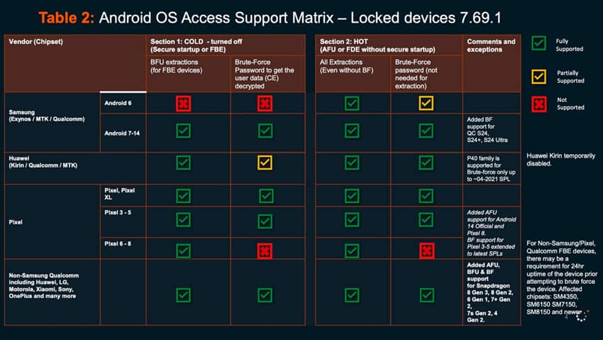 Що стосується пристроїв на Android, то поки що найкраще себе показують останні смартфони Google. При спробі злому Pixel 6, Pixel 7 та Pixel 8 фахівці стикаються з певними труднощами.