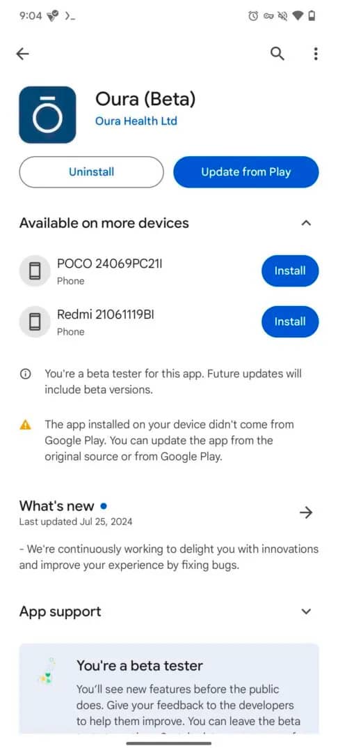 Розбір APK виявив, що користувачі зможуть побачити цю опцію у списку програм у Play Store. Якщо програма була завантажена не з офіційного магазину, на екрані відображатиметься повідомлення: «Програма, встановлена на вашому пристрої, не завантажена з Google Play. Ви можете оновити програму з оригінального джерела або Google Play».