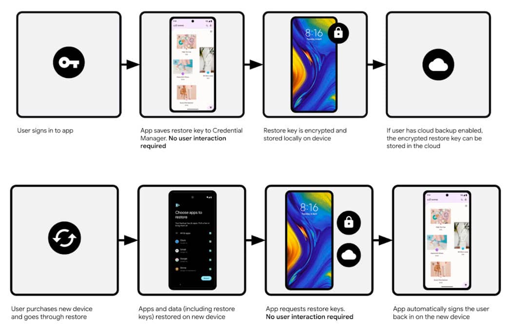 Як наголошується в матеріалі порталу Android Authority, розробники ОС від Google можуть впровадити деякі фонові автоматизовані дії, щоб забезпечити «безшовне та безшумне відновлення входу, відновлюючи стан програми та логіни без необхідності відкривати програму». У зв'язку з цим в API менеджера облікових даних Android з'явилася функція Restore Credentials (Відновлення облікових даних), яка не повинна нічим поступатись аналогічному механізму в iOS.