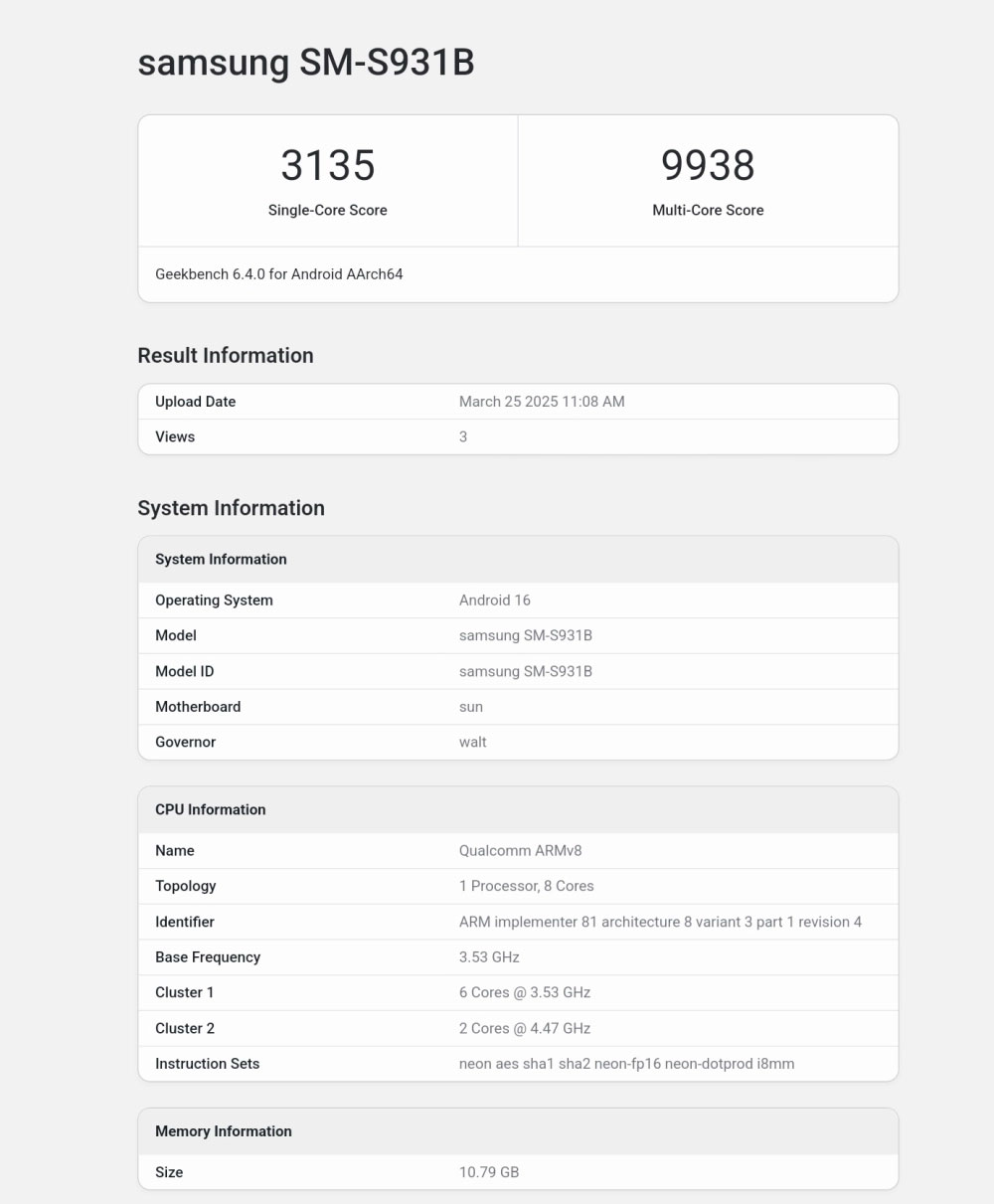 Інсайдер Тарун Ватс виявив у базі бенчмарку Geekbench смартфон Galaxy S25, який працює під керуванням Android 16.