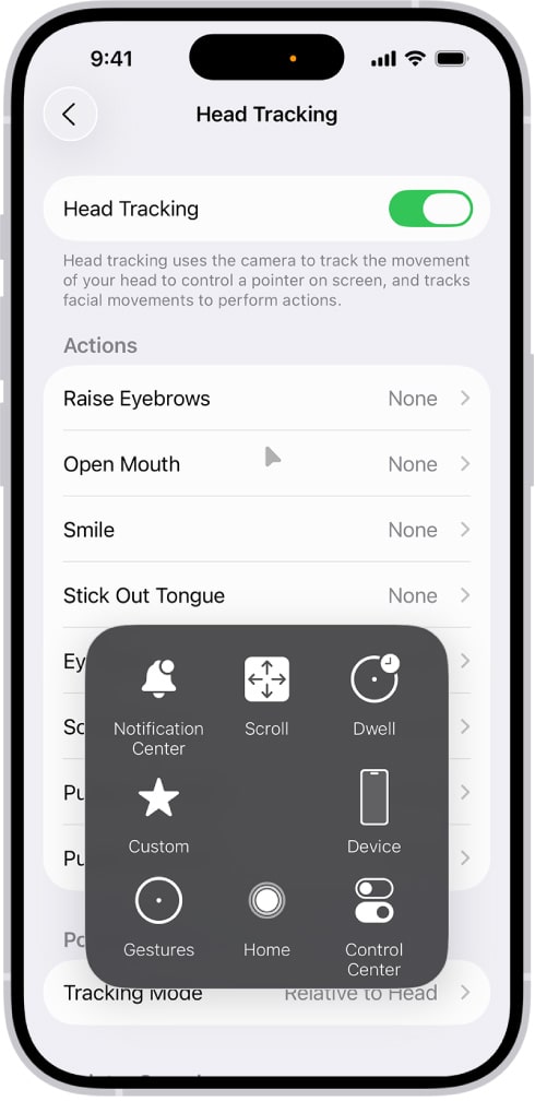 Для її використання потрібно пройти за такими параметрами: «Універсальний доступ» → «Відстеження рухів голови». У меню можна налаштувати спрацювання більшості системних дій на мімічні дії обличчя на кшталт моргання чи зморщування носа. Для активації не забудьте увімкнути опцію «Відстеження рухів голови».