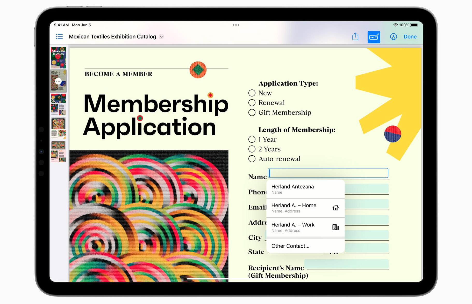 - Автозаповнення PDF. Можливість швидко додати своє ім'я, адресу або іншу інформацію в документи вимагатиме щонайменше iPad 7, 11-дюймового iPad Pro (другого покоління) або 12,9-дюймового iPad Pro (четвертого покоління).