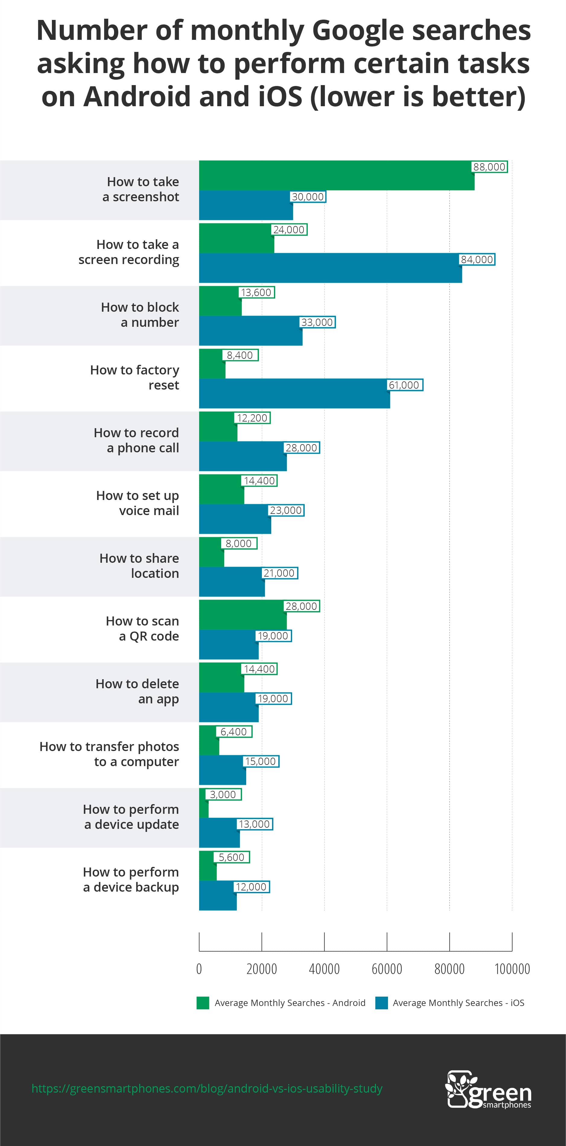 Виявилося, що у користувачів Android менше питань щодо базових функцій у 10 випадках з 12: iOS виграє тільки за простотою створення скріншотів та сканування QR-кодів. Якщо зважати на всі проаналізовані запити, то на користувачів iOS припадає близько 358 тисяч на місяць — проти 226 тисяч у власників Android.