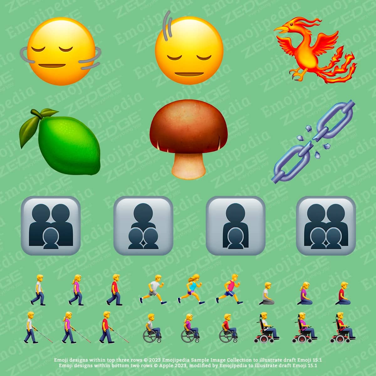 Як видно, з'являться емодзі голови, що хитає вертикально та горизонтально. Крім цього, очікується коричневий гриб, фенікс, лайм, зламаний ланцюг та чотири варіанти сім'ї: двоє дорослих та дитина; дорослий та двоє дітей; дорослий та дитина; двоє дорослих та двоє дітей. Буде введено й інші емодзі, включаючи позначення людей з обмеженими можливостями.