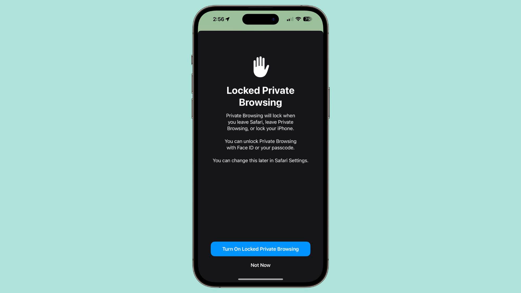 Друге нововведення — змінився екран приватного доступу Safari. Тепер, якщо запустити інкогніто, браузер запропонує включити блокування за допомогою обличчя або пальця. Вікно з'являється лише один раз.