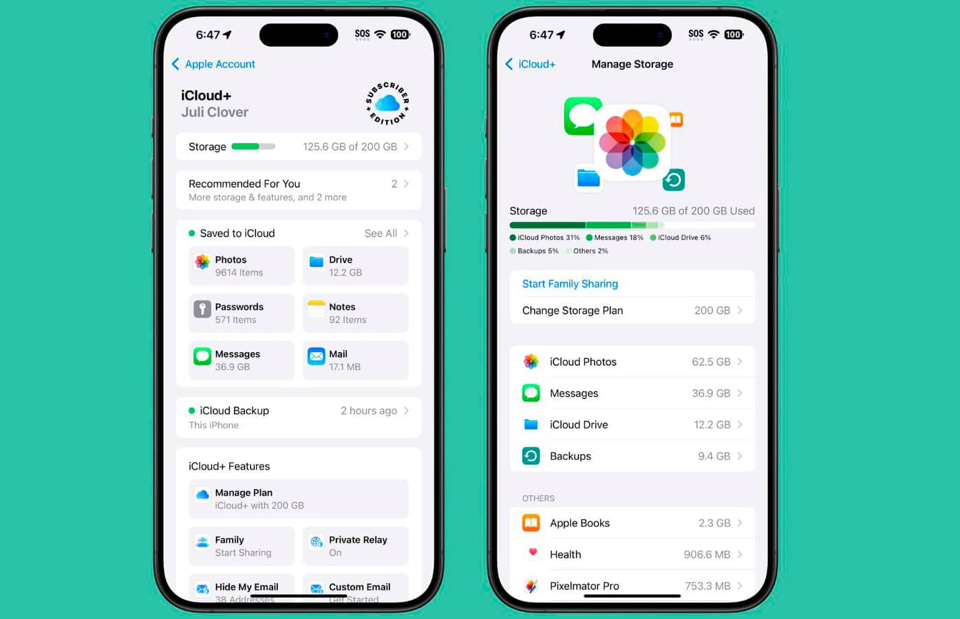 Крім того, компанія переробила зовнішній вигляд сторінки керування хмарними сервісами iCloud в iOS 18. Тепер можна відразу побачити, скільки місця в хмарі займають нотатки, електронні листи та інші об'єкти. Якщо користувач має передплату iCloud+, у заголовку сторінки відображається піктограма Subscriber Edition. А в секції «Рекомендовано для вас» з'являються поради щодо використання iCloud на кшталт видалення старих резервних копій.