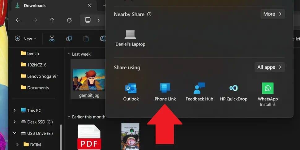 Як і очікувалося, нова функція буде працювати через програму Phone Link. Після синхронізації пристроїв залишиться лише клацнути правою кнопкою миші по тому, що ви хочете відправити, вибрати в контекстному меню «Поділитися», а потім натиснути Phone Link.