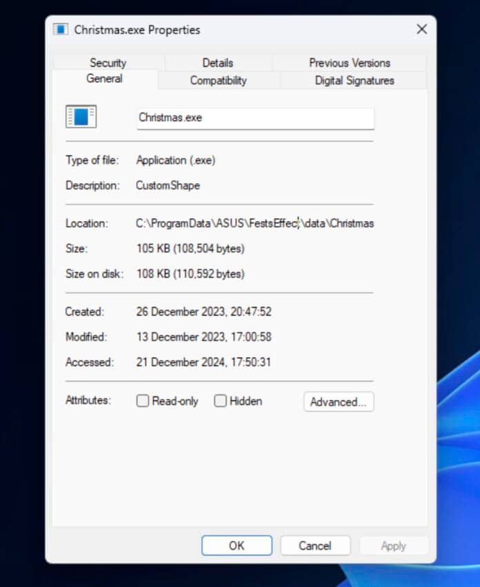 У диспетчері завдань цей банер був відзначений як процес Christmas.exe. Через це багато користувачів запідозрили вірус з огляду на те, що раніше шкідливі програми з новорічною тематикою вже з'являлися в мережі. Однак згодом з'ясувалося, що банер є частиною маркетингової акції Asus, вбудованою у програму Armoury Crate, встановлену на деяких пристроях компанії.