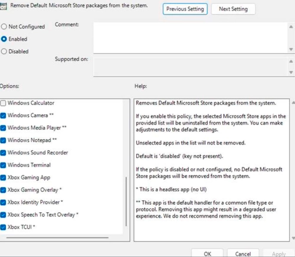 Новий параметр групової політики називається «Видаляти пакети Microsoft Store за замовчуванням із системи» і дозволяє користувачам контролювати, які програми вони хочуть бачити на своєму комп'ютері: