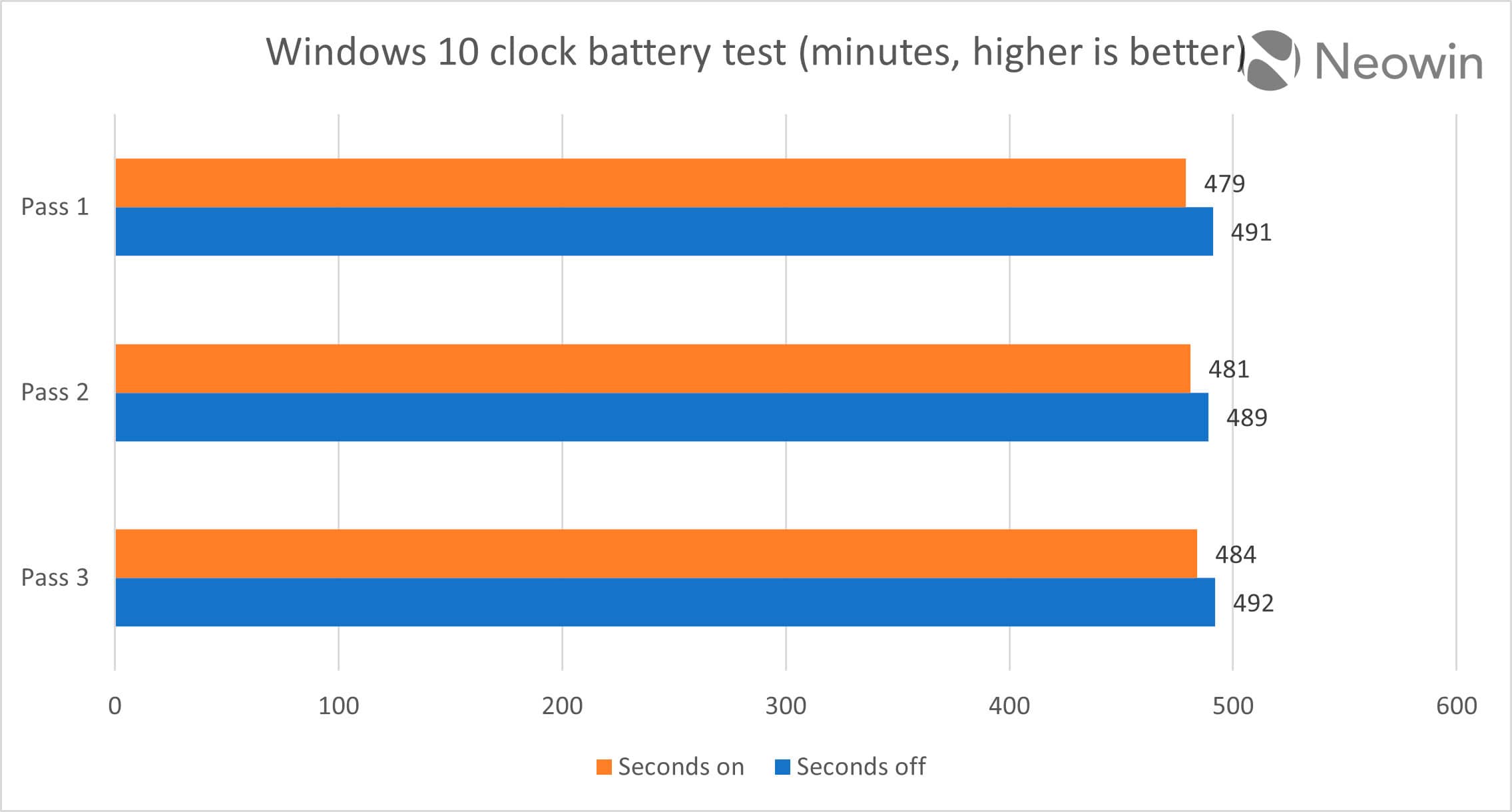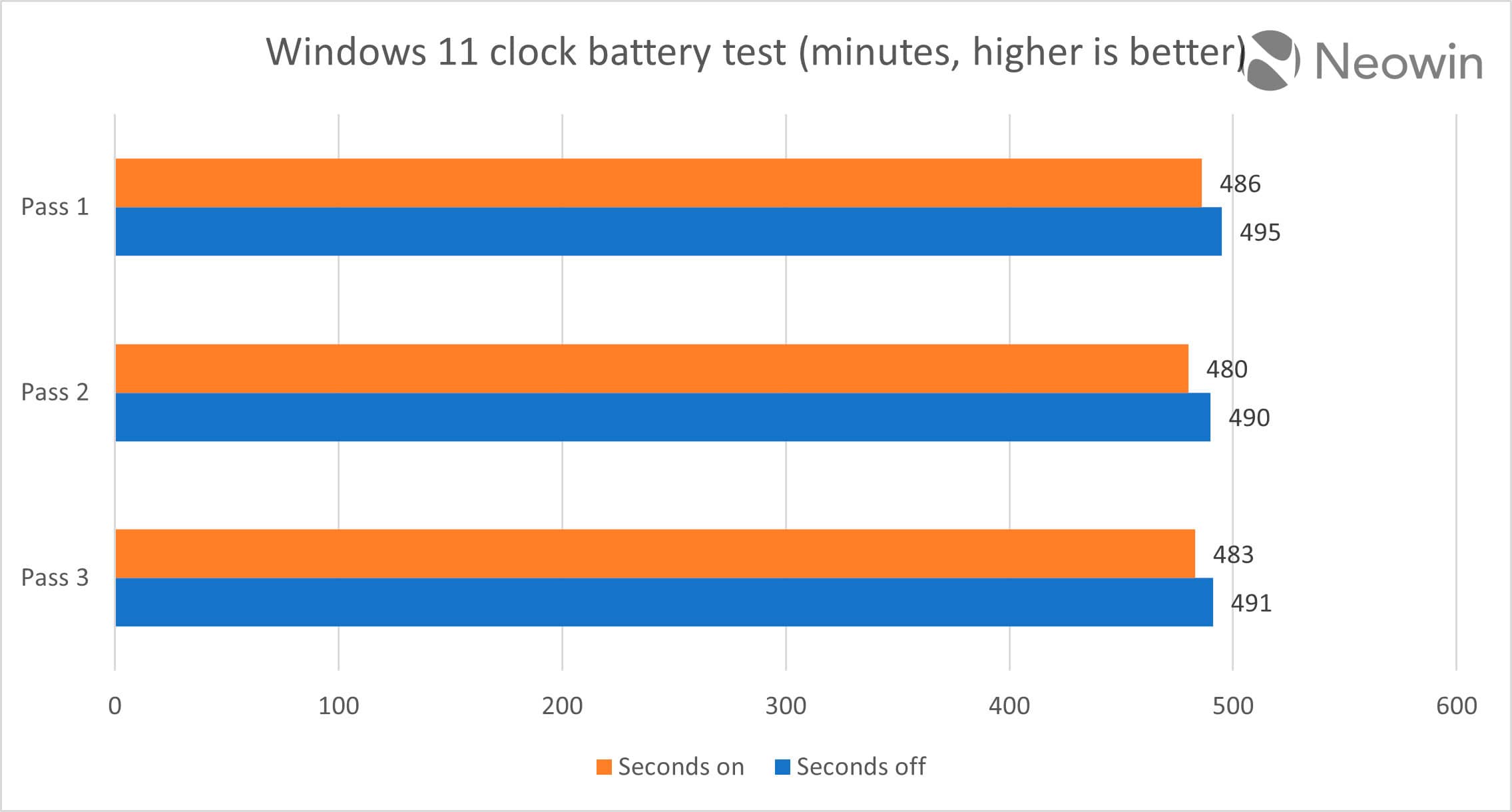 Автор ресурсу Neowin провів експеримент, щоб дізнатися, як впливає на автономність ноутбука включення цієї функції. Він використовував 14-дюймовий HP Pavilion x360 із процесором Intel Core i3 11-го покоління, 16 ГБ ОЗП та Windows 11. При включенні відображення секунд, режиму польоту та максимальної яскравості ноутбук пропрацював без навантаження в середньому на 1,892% менше, ніж без секунд. Потім такий же тест повторили на тому ж ноутбуці із встановленою Windows 10. Включення системного годинника з секундами знизило час автономної роботи в середньому на 1,902%.