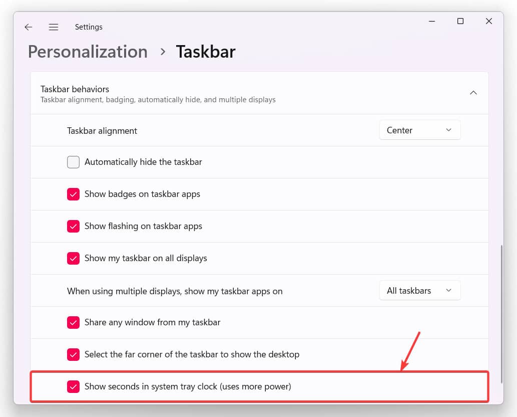 У поточній версії системи достатньо поставити одну галочку в програмі «Параметри» («Персоналізація» > «Панель завдань» > «Поведінка панелі завдань»). Примітно, що Windows 11 використовує той же ключ реєстру для включення / відключення секунд в системному годиннику, хоча в цій версії розробники представили абсолютно нову панель завдань.