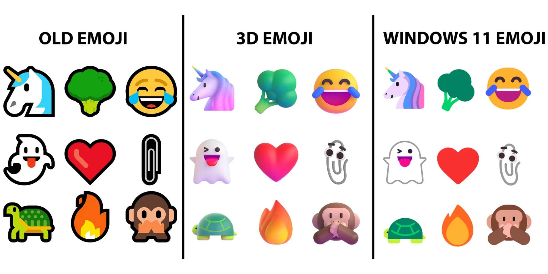 Нові емодзі дуже схожі на ті, що з'явилися у Microsoft Teams на початку 2022 року. За рахунок градієнта вони виглядають об'ємнішими за емодзі, які використовуються в Windows 11 зараз. Ось наочне порівняння смайликів на старті Windows 11, об'ємних версій та тих, що доступні в системі зараз: