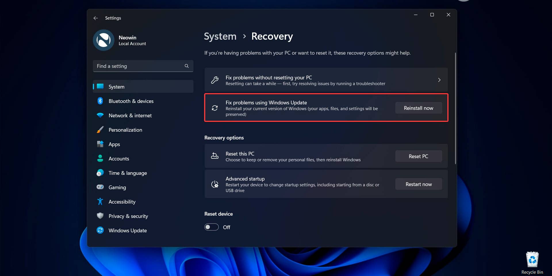 Щоб скористатися опцією, потрібно перейти в «Налаштування», потім в «Систему» та «Відновлення», а там натиснути кнопку «Перевстановити зараз». Після цього машина запропонує підтвердити дію та перейти в «Центр оновлення Windows», щоб знайти та завантажити збірку. Весь процес повторює класичне встановлення ОС.