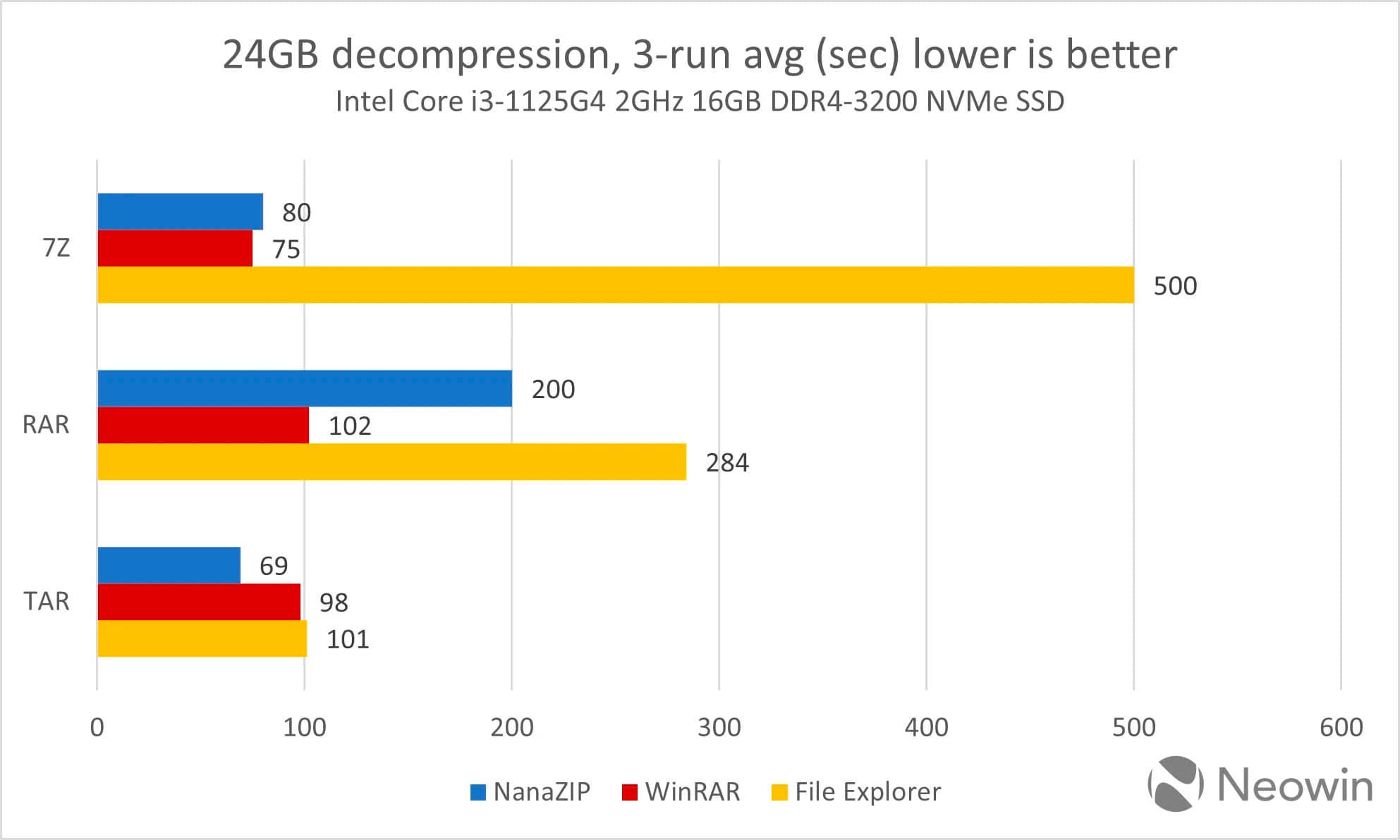 Щоб розархівувати RAR файл розміром 24 ГБ, вбудована в систему технологія витрачає втричі більше часу, ніж WinRAR. Якщо розглядати архіви у форматі 7z, то тут ще гірше: на розпакування пішло майже дев'ять хвилин, а WinRAR і утиліта NanaZIP впоралися приблизно за одну. Єдиний формат, при роботі з яким нативний розпакувальник Windows 11 практично не поступився WinRAR та NanaZIP, це TAR.