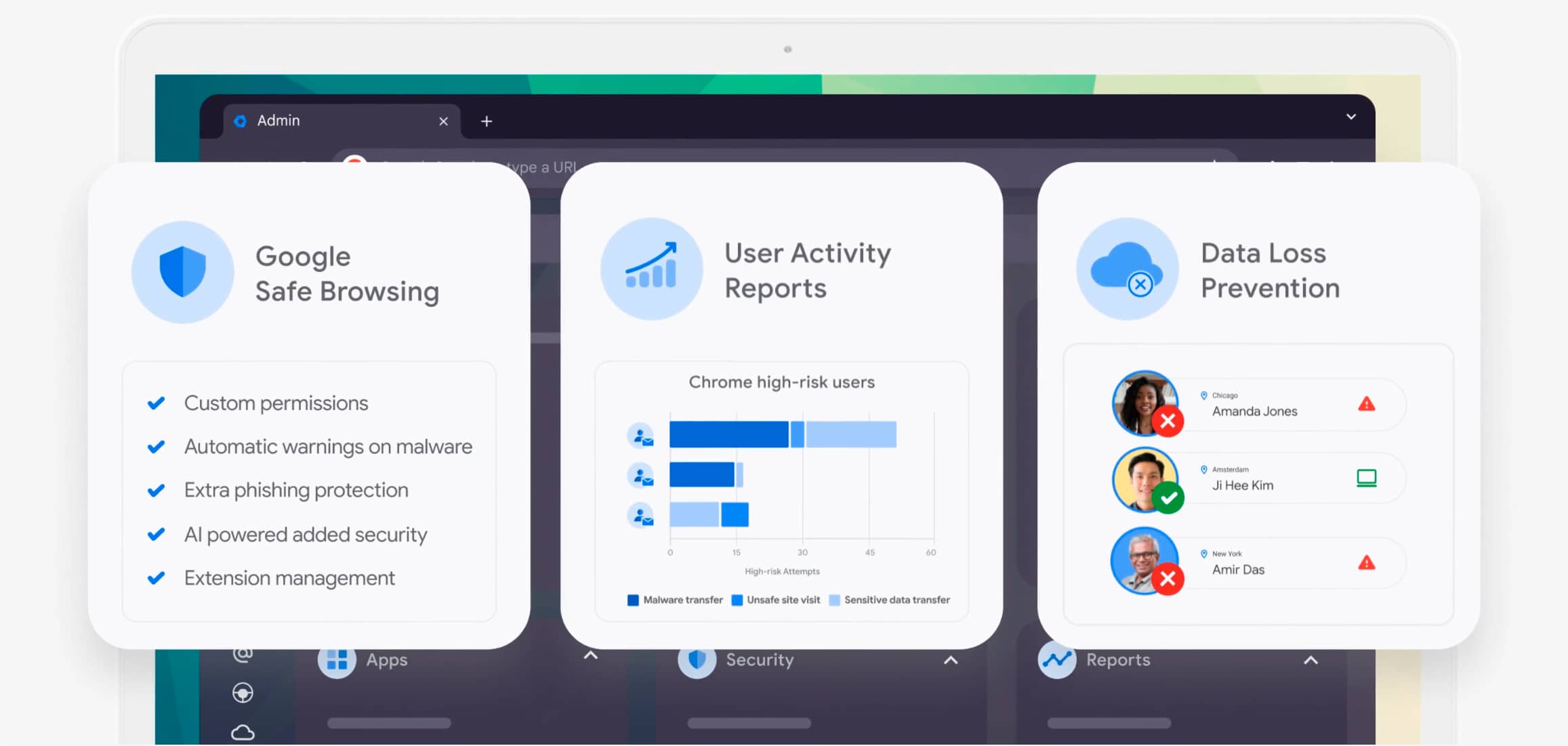 Крім того, Chrome Enterprise Premium пропонує можливість автоматичного оновлення для захисту від вразливостей, що виникають, динамічну фільтрацію URL, категоризацію сайтів і блокування підозрілих надбудов, наприклад, для захисту від злому та фішингу.