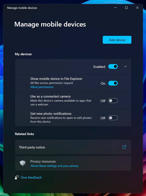 Щоб увімкнути цю функцію, потрібно дозволити доступ до файлів за допомогою параметрів Windows 11 > «Bluetooth та пристрої» > «Мобільні пристрої» > «Керування пристроями».