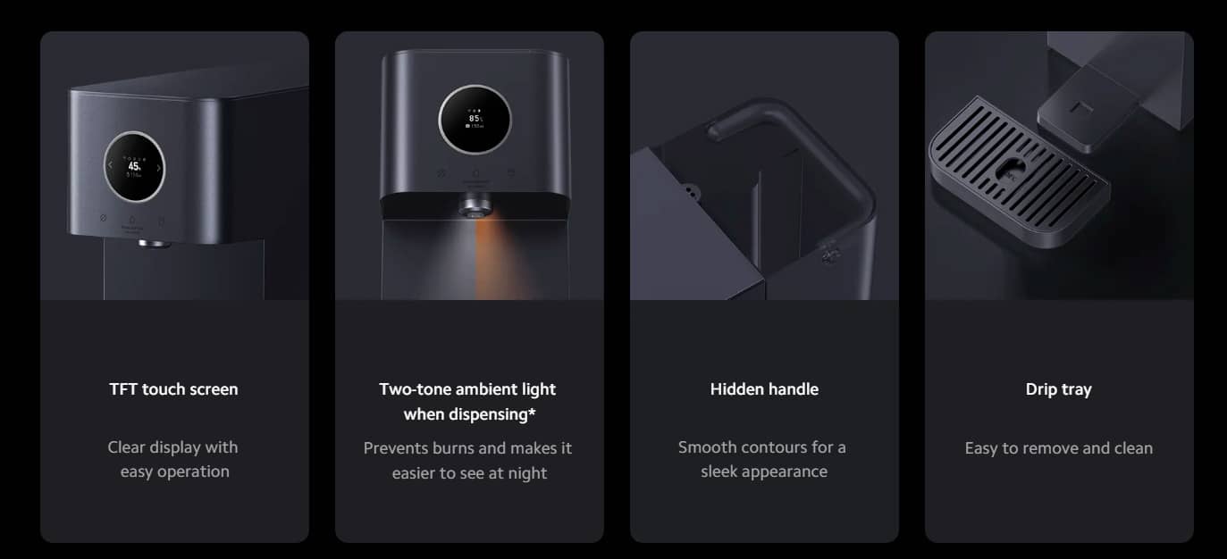 Нагрів води відбувається за лічені секунди. Крім того, є кілька встановлених режимів, включаючи «Кімнатна температура», «Кава» та «Кип'ячення води». З додаткових функцій виділимо двокольорове підсвічування при подачі води та приховану ручку для легшого переміщення пристрою. Xiaomi рекомендує щорічно міняти фільтр для оптимальної ефективності очищення.