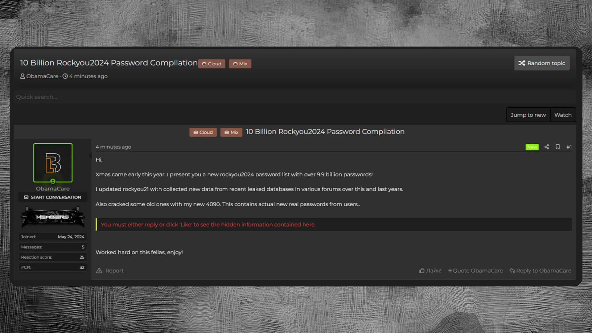 Користувачі виявили найбільшу добірку злитих паролів в історії Інтернету. Файл під назвою rockyou2024.txt був опублікований 4 липня користувачем ObamaCare на одному з хакерських форумів і тепер становить серйозну небезпеку.