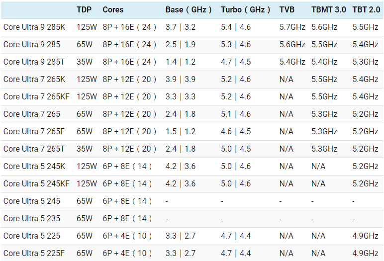 Варто відзначити, що моделі з індексом F не мають вбудованої графіки (iGPU), решта оснащена графікою Intel Xe2. Моделі з індексом T є варіантами з низьким TDP, тоді як процесори з індексом K забезпечують вищі тактові частоти (є також пара моделей KF). Дані за двома моделями Core Ultra 5 поки що відсутні, але вони будуть на нижньому рівні продуктивності.