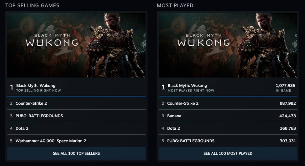 Найпопулярнішою грою останніх днів визнано Black Myth: Wukong — понад 1 000 000 геймерів грають в екшен про людину-мавпу на добу.