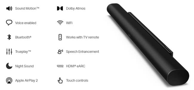 Пристрій включає функцію Speech Enhancement, яка покращує чіткість діалогів, і має унікальну зігнуту форму, що гармонійно поєднується з великими телевізорами, не закриваючи екран. Гратчаста конструкція дозволяє звуку поширюватися у всіх напрямках, а нова архітектура центрального каналу підвищує чіткість мови, з можливістю регулювання налаштувань через програму Sonos.