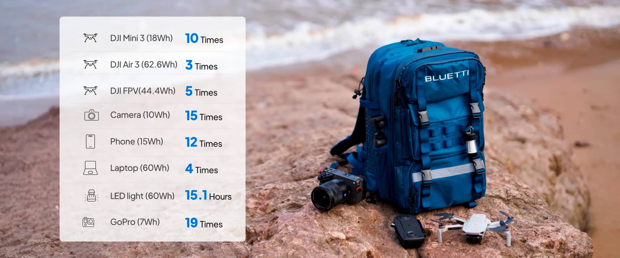 Вся фішка в тому, що станція вбудовується в рюкзак, в якому можна переносити багато різних гаджетів і заряджати їх на ходу. Наприклад, техніку та аксесуари для зйомки фото чи відео.