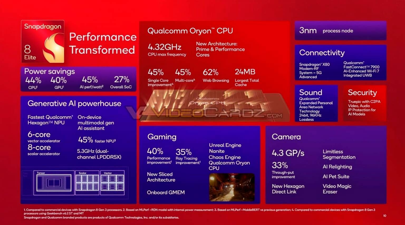Процесор оснащений ядрами Oryon. Усього на борту вісім ядер: шість із частотою 3,53 ГГц і два на 4,32 ГГц. Кеш — 24 МБ L2. Графіка — Adreno 830. Технологія виробництва — 3 нм.