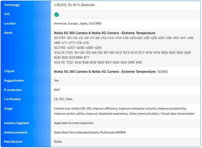 - Nokia 5G 360° Camera — варіант для екстремальних температур: призначений для використання в умовах екстремального клімату.