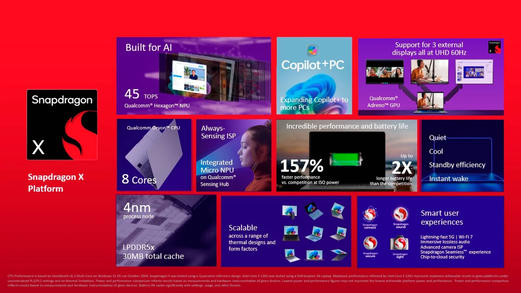 Незважаючи на те, що Snapdragon X - це відносно бюджетний процесор, Qualcomm обіцяє кращу продуктивність на ват в порівнянні з Intel Core 5 120U і найкращий час автономної роботи в різних тестах.