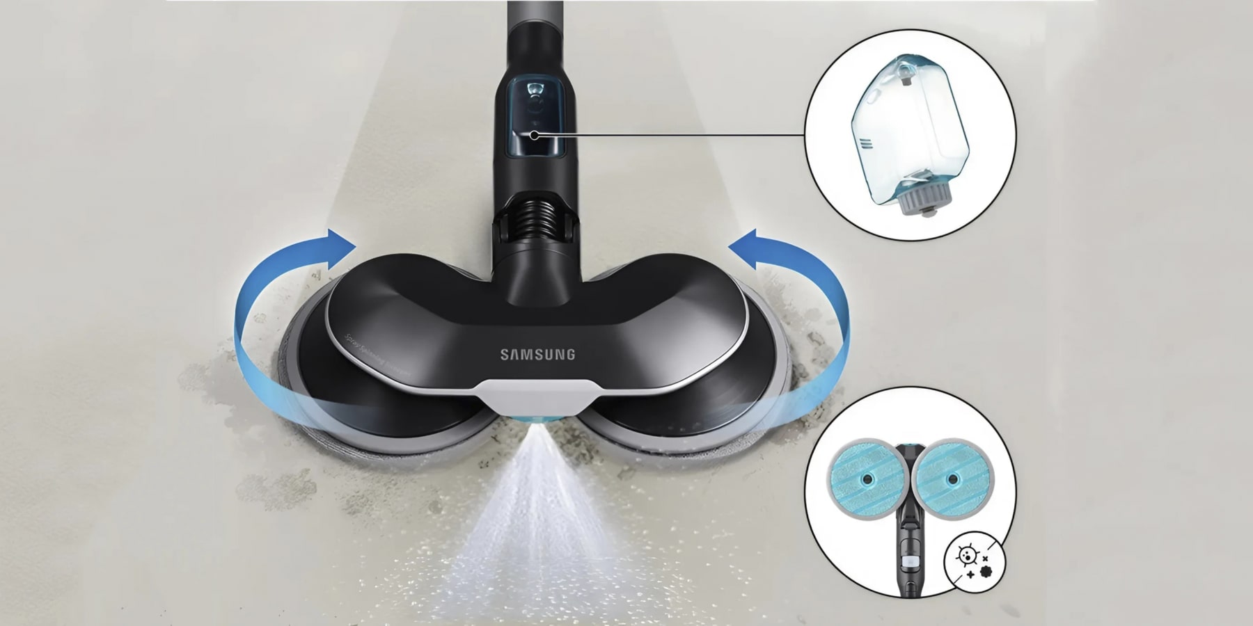 У комплекті маса насадок, у тому числі подвійні валики, які обертаються, що дозволяє відтирати плями, що в'їлися, в режимі вологого прибирання. Час роботи від акумулятора — до 100 хвилин. Повна зарядка триває 5 годин.