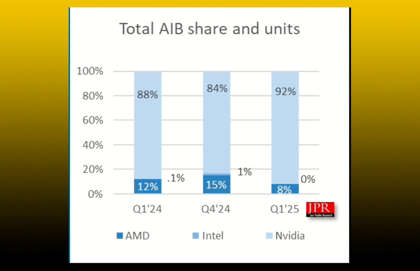 У першому кварталі 2025 року частка Nvidia сягнула 92% на ринку дискретних графічних прискорювачів. Це на 8,5% вище, ніж у попередньому кварталі.