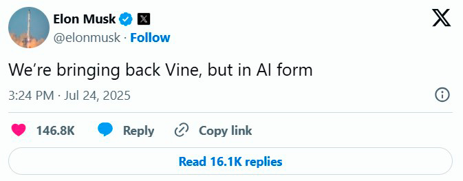 Згадки про Vine спливали 2024-го і раніше 2025 року, коли Маск у відповідь на пропозицію користувача про повернення платформи відповів, що його команди «вивчають це питання».