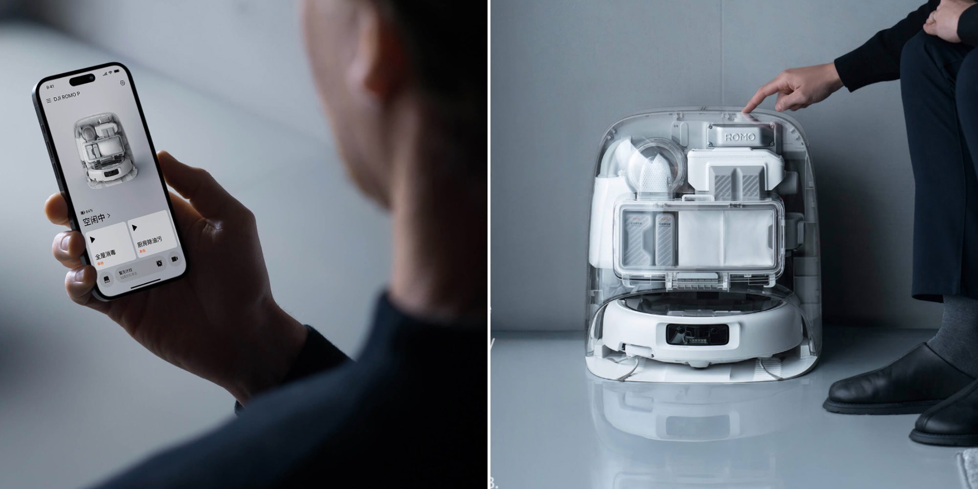 Для вологого прибирання передбачені дві швабри, що обертаються, і вбудований резервуар для води об'ємом 164 мілілітри. Додатково є відсіки для засобів для чищення та дезінфікуючих засобів. Користувачі можуть налаштувати план збирання, наприклад, доручити ROMO P видалити кухонний жир за допомогою миючого гелю або провести ретельне збирання з використанням антибактеріального засобу.