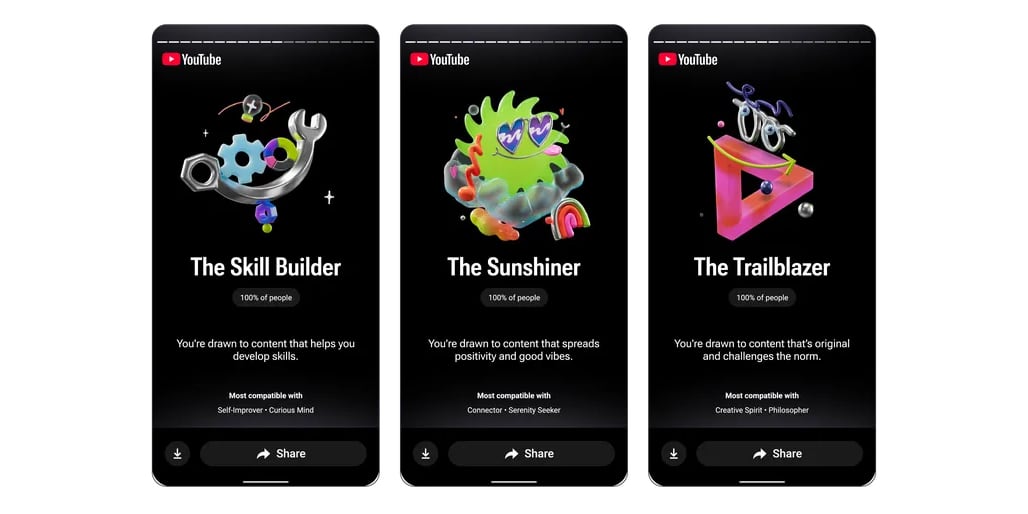 Користувачеві надається «тип особистості» на основі того, що він дивився протягом року — наприклад, «Шукач пригод». Також є музична статистика, яка працює окремо від підсумків року у YouTube Music.