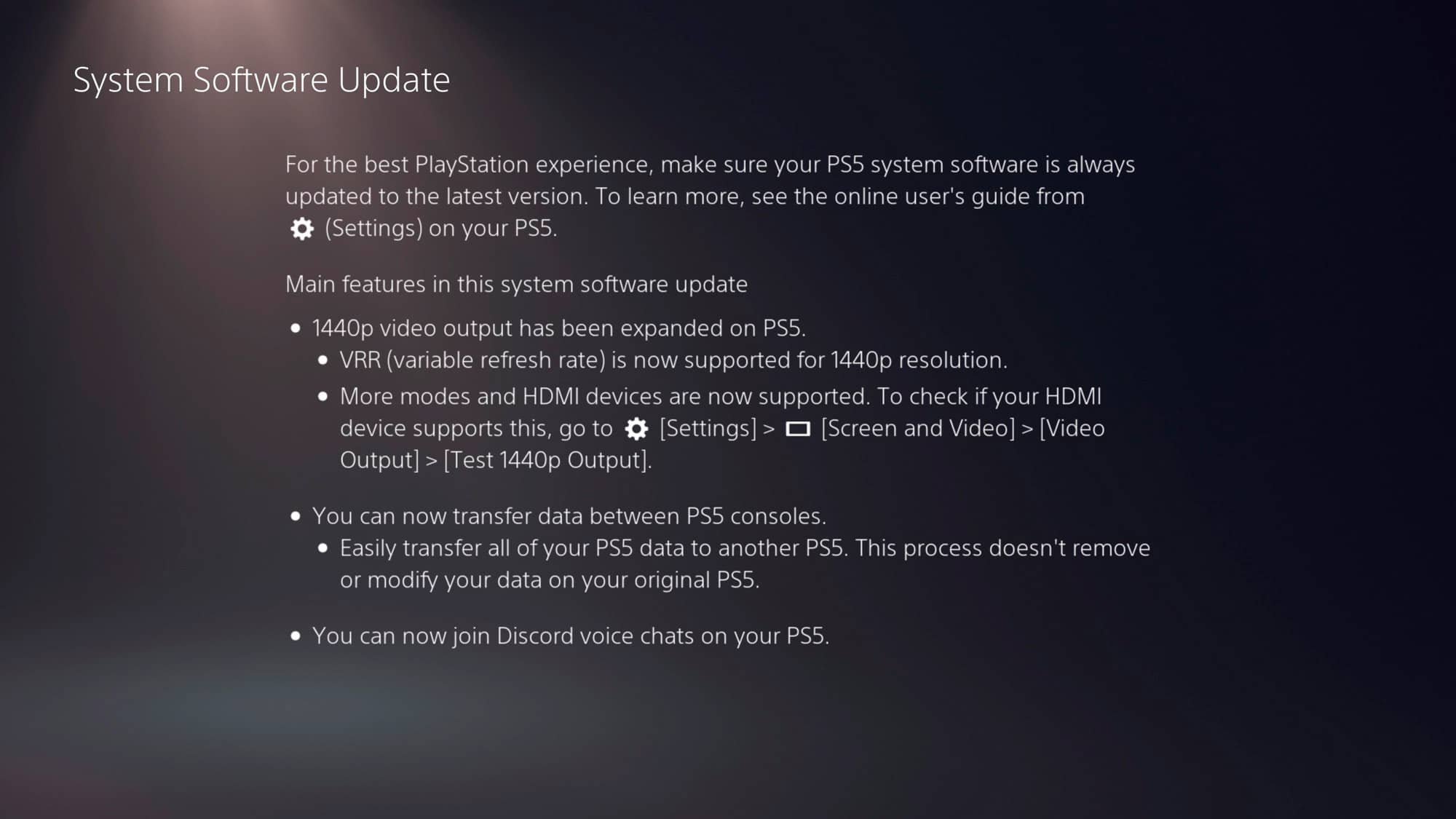 Крім підтримки Discord, на консолях з'явився режим змінної частоти оновлення VRR для роздільної здатності 1440p, голосові команди (поки що тільки в США та Великобританії) та покращення інтерфейсу функції спільного використання екрана та групових чатів на панелі керування PS5.