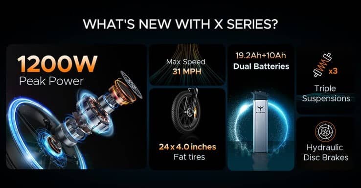 X24 має схожу конструкцію з X26, тоді як X20 має традиційний дизайн міського електричного велосипеда. Тріо отримало покришки розміром 24 х 4.0 дюйми та мотор потужністю 1200 Вт, що забезпечує швидкість до 50 км/год. X20 пропонує запас ходу 200 км, X24 — до 240 км, а X26 — до 230 км.