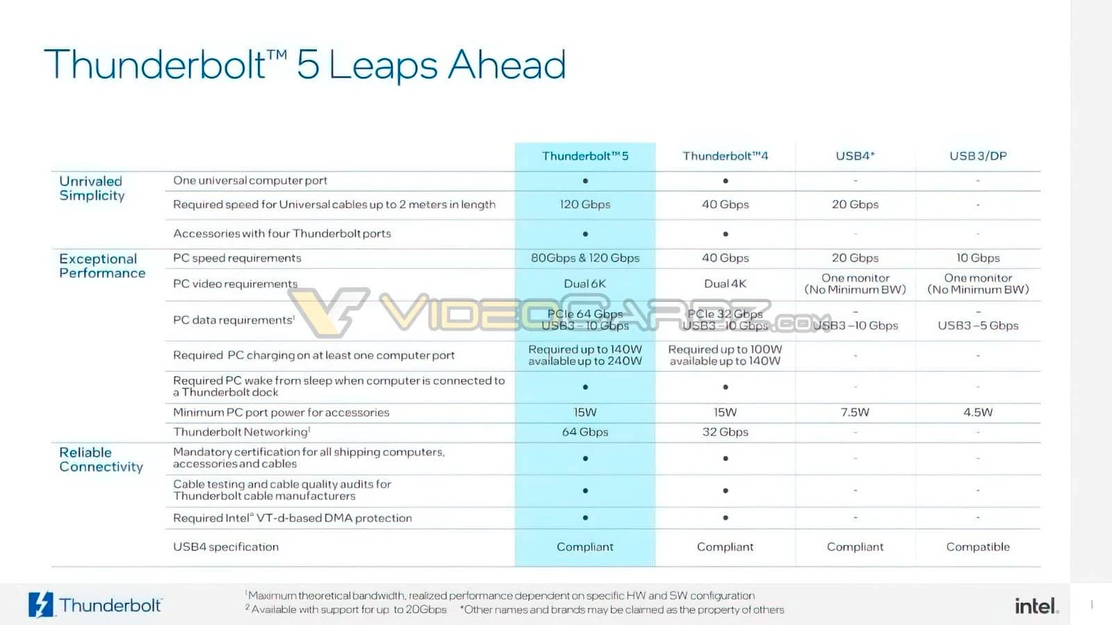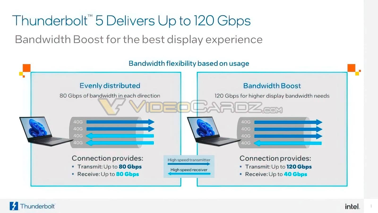 Thunderbolt 5 передбачає пропускну здатність до 120 Гбіт/с, хоча Intel заклала спрощений режим роботи з двонаправленим з'єднанням зі швидкістю 80 Гбіт/с. Thunderbolt 4 зі своїми 40 Гбіт/с відстає від новинки щонайменше вдвічі.