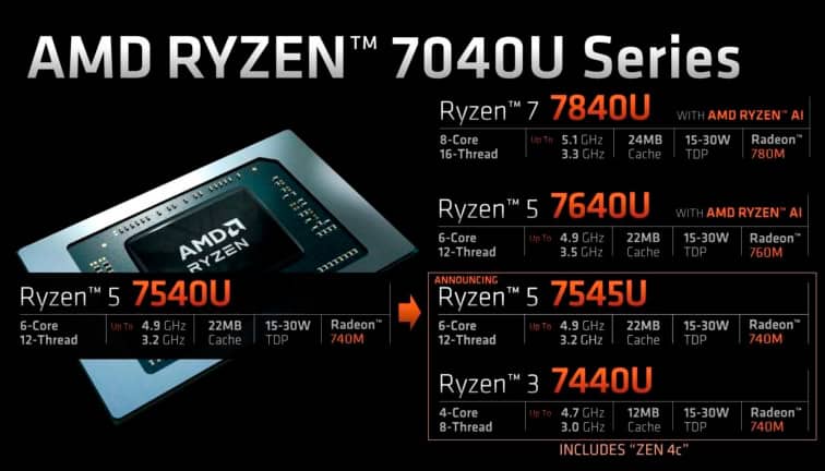 Таким чином компанія підтримала сучасний тренд на гібридну архітектуру. Йдеться про моделі Ryzen 5 7545U та Ryzen 3 7440U, які розширили серію Ryzen 7040U.