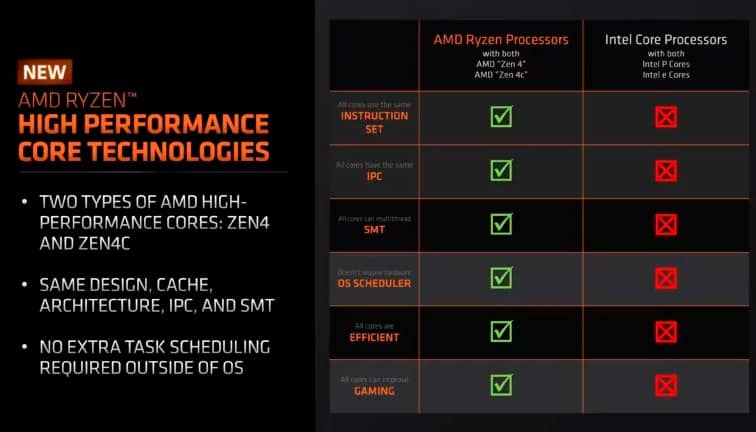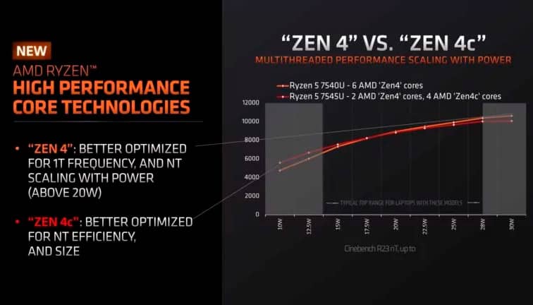 Компанія AMD заявляє, що ядра Zen 4 у чіпах з гібридною архітектурою оптимізовані для роботи в однопотоковому навантаженні, Zen 4c, навпаки, — у багатопотоковій. При цьому Zen 4c показують більш високу продуктивність, коли йдеться про екстремально низьке енергоспоживання — до 10 Вт.