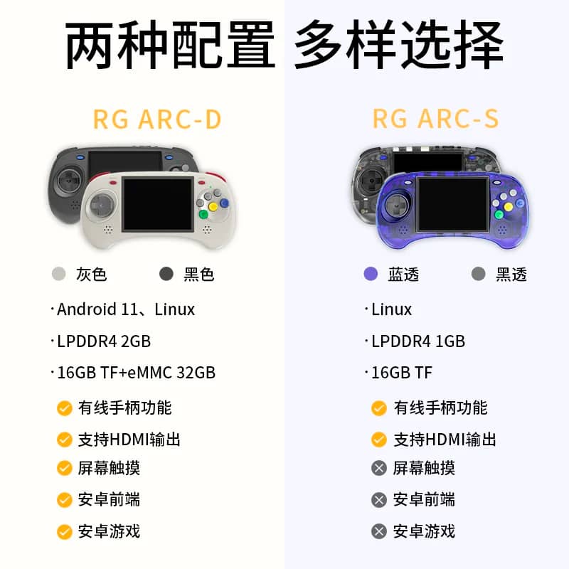 Модель RG ARC-S працює виключно на Linux та має стандартний екран без функції сенсора, 1 ГБ оперативної пам'яті LPDDR4, 16 ГБ TF-пам'яті, слот для карток пам'яті до 512 ГБ.