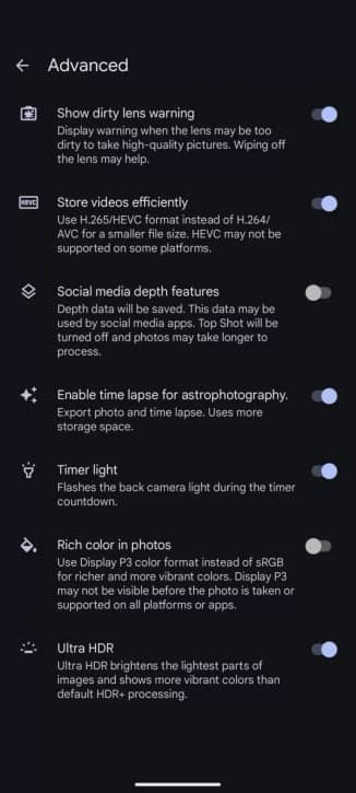 Оновлення також дозволяє користувачам налаштовувати «Таймер долоні» на «Завжди увімкнено» або «Увімкнено лише при встановленні таймера на 3 або 10 секунд». Крім того, тепер є окремий перемикач Ultra HDR-фотографій в меню «Додаткові налаштування».